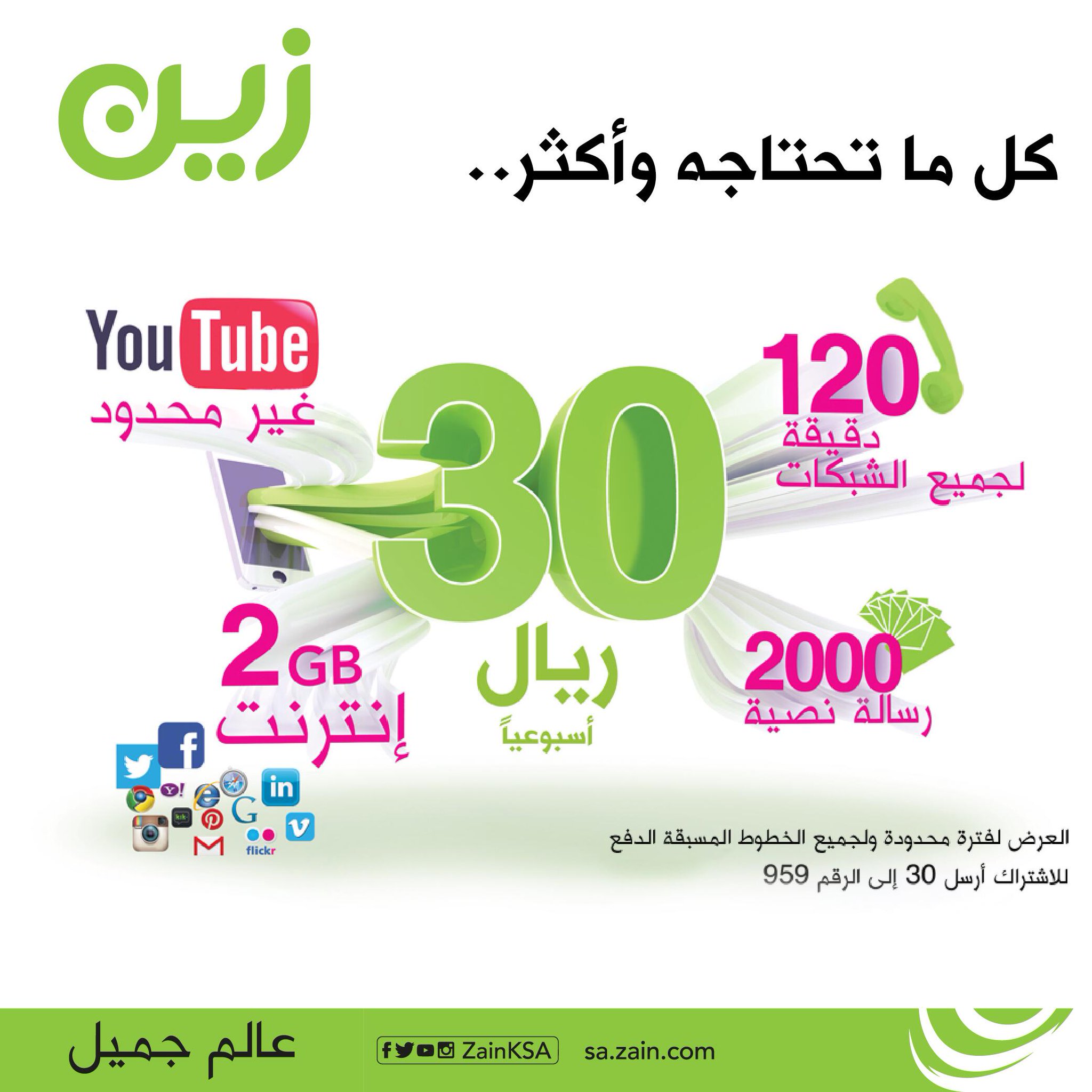 زين السعودية A Twitter الآن ولمد ة محدودة من زين احصل على 2 جيجابايت مج ان ا و120 دقيقة مكالمات لجميع الشبكات بـ30 ريال في الأسبوع Http T Co H0bud677c6