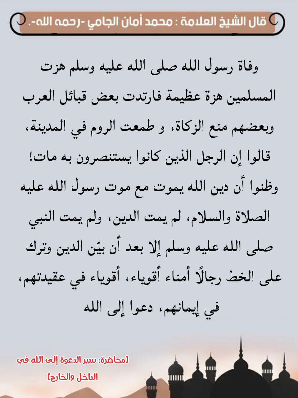 درر د محمد أمان الجامي در توییتر الشيخ د محمد أمان الجامي وفاة رسول الله صلى الله عليه وسلم هزت المسلمين هزة عظيمة فارتدت بعض قبائل العرب وبعضهم منع الزكاة و طمعت