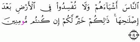 و إ ل ى م د ي ن أ خ اه م ش ع ي ب ا ق ال ي ا ق و م اع ب د وا الل ه م ا ل ك م م ن إ ل ه غ ي ر ه ق د ج اء ت ك م ب ي ن ة م ن ر ب ك م ف أ و ف وا ال ك ي ل و ال م يز ان و ل ا ت ب خ س وا الن اس أ ش ي اء ه م و ل ا ت ف س د وا ف ي ال أ ر ض
